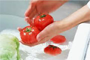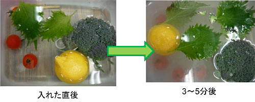 農薬などの付着・残留にもよりますが、しばらくすると水の表面に油膜のようなものが浮かんできます。その後、素早く水道水で食材についたこの水を洗い流します。